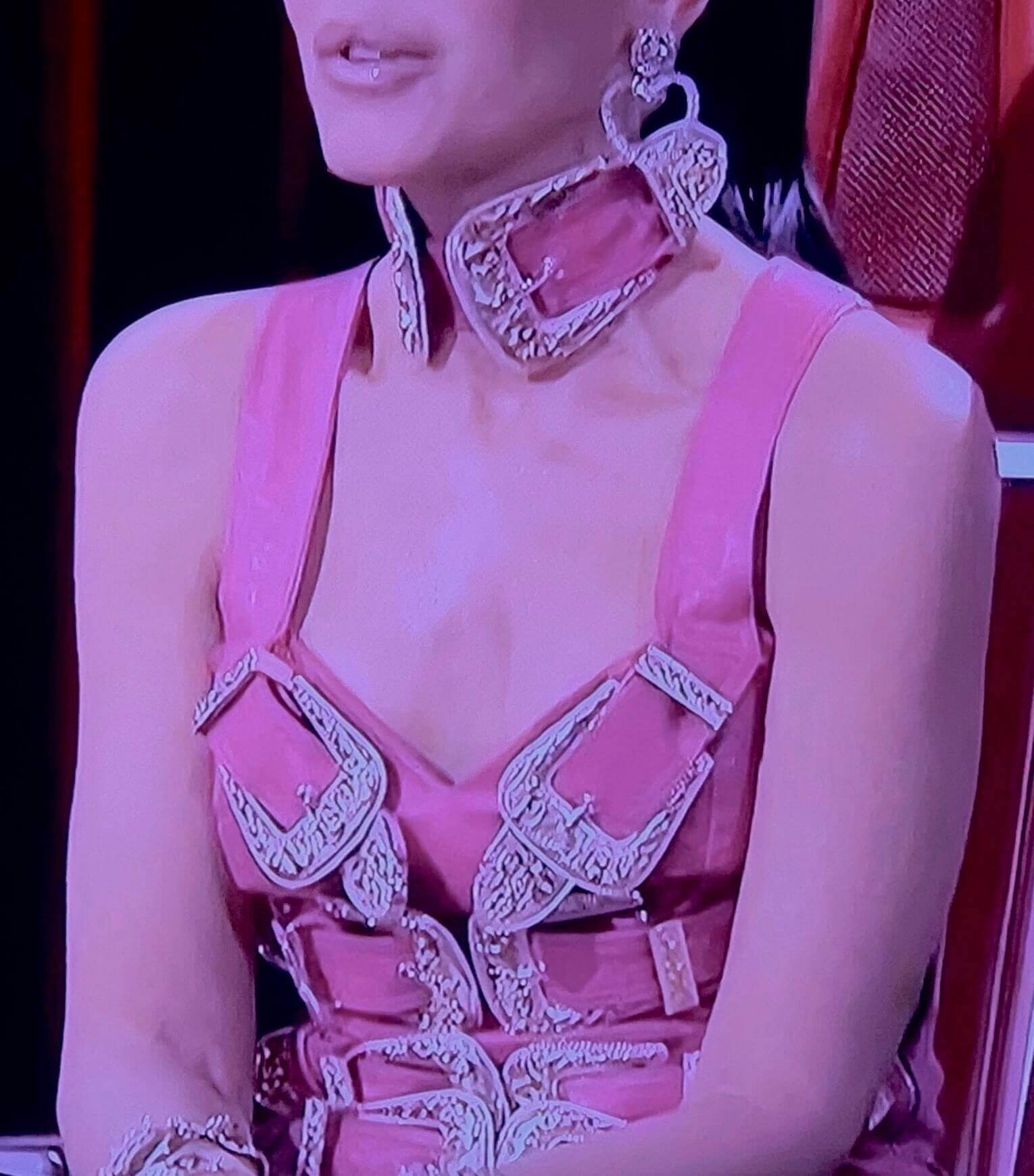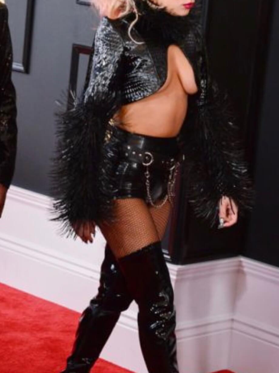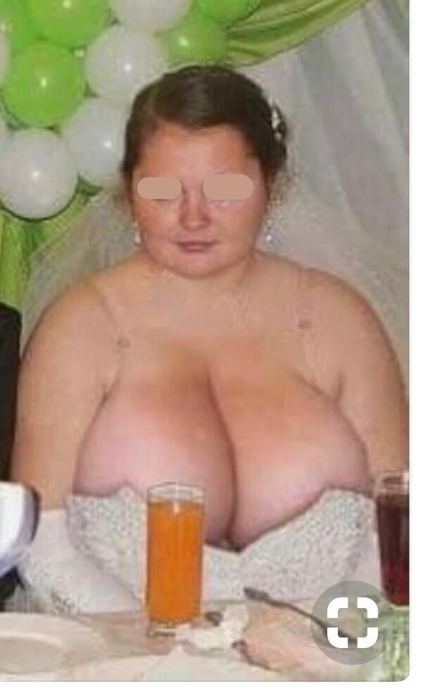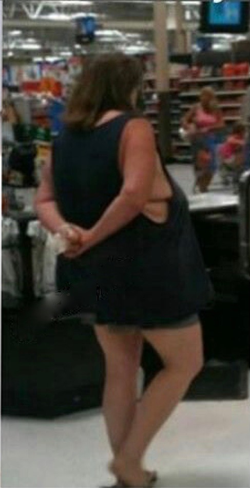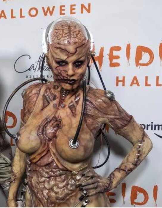 Again... Why oh why? In what appears a fresh scar on her breasts, this lady's choice of evening attire is a bit curious.