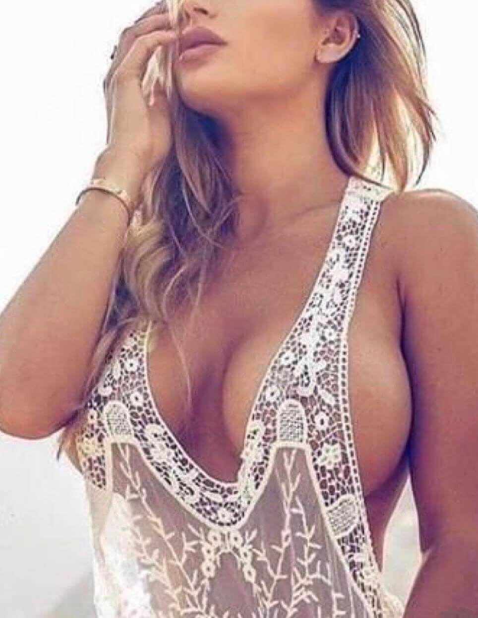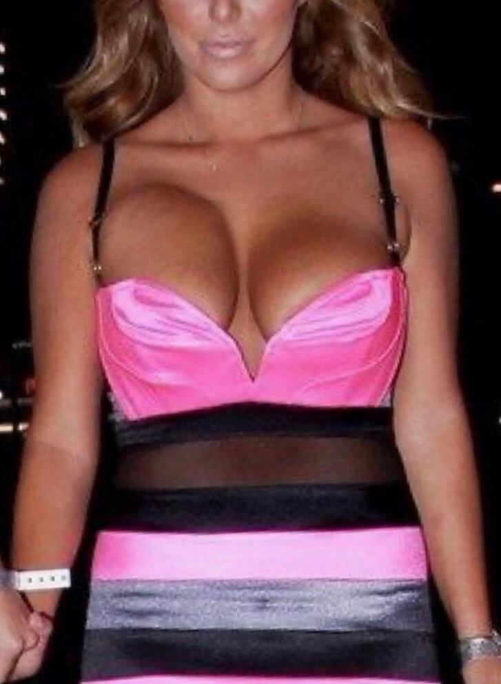 "Side boobs". This well-known model shows precisely the side-boob look many desire. Note the side of her breasts extends beyond her chest wall. Many women tell me they find this a sensual look and feel. To create this, a woman will need a wider diameter implant. Such an implant should also give tighter cleavage and more upper breast fullness.