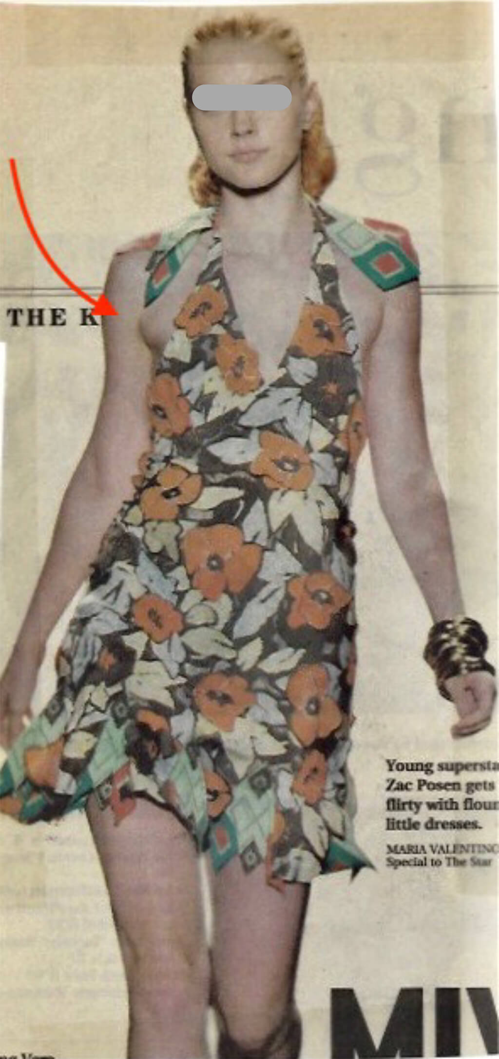This image I saved from the Fashion pages of The Kansas City Star. This supermodel obviously struggles with an embarrassing problem common to many women. Regardless of how large or small a woman’s breasts, the tail of the breast (that portion nearest the underarm) can be over-developed and bulge out when wearing certain sleeveless or halter fashions. For women suffering with this bit of anatomy, it can limit your choice in attire. Fortunately, this is a situation easily remedied by surgery.
